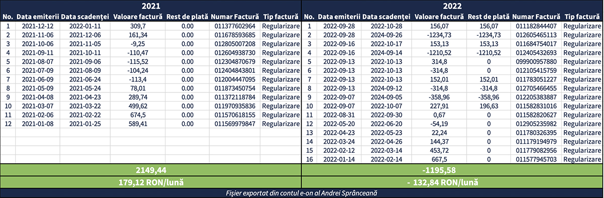 Exact ca în poza de mai jos, unde se vede situația completă a facturilor achitate în anii 2021 și 2022, exportată direct din contul E-ON.